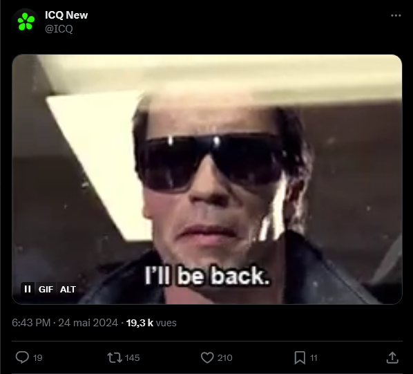Malgré l'annonce de sa fermeture, ICQ a laissé planer un doute sur les réseaux sociaux avec un GIF de Terminator légendé « I'll be back ». Que cela se concrétise ou non, ICQ restera à jamais le premier service de messagerie instantanée à avoir marqué l'histoire d'Internet.